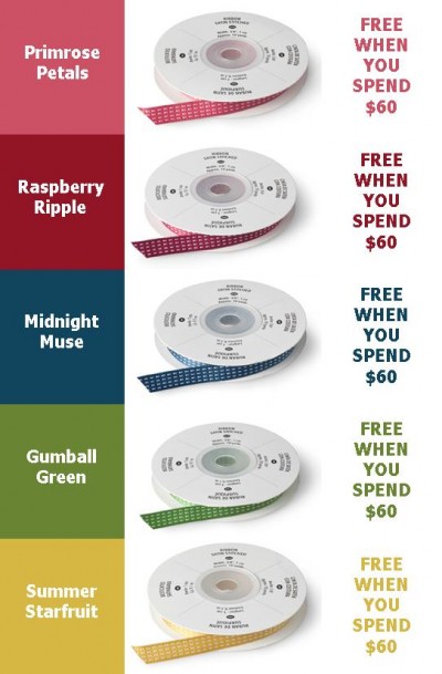 For the month of October, get a FREE 9.1 metre roll of 3/8″ (1 cm) Stitched Satin Ribbon-at $15.95 value-for every $60 you spend!