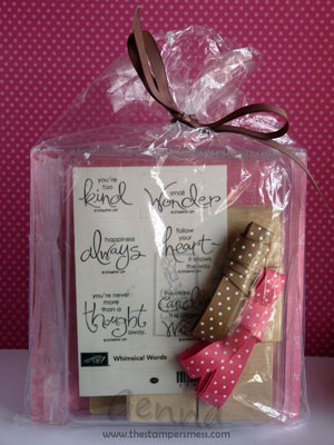 And here’s the prize – the Whimsical Words stamp set, Polka Dot ribbon samples in Soft Suede and Melon Mambo and a selection of 6″ x 6″ patterned papers! Lisa, I’ll be in touch soon to arrange to get it to you!