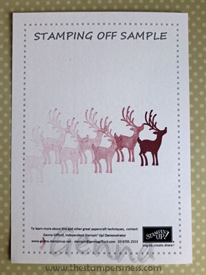 In this sample I simply inked up the reindeer with Bravo Burgundy ink and then kept on stamping without re-inking. Each time I stamped a reindeer friend he was a slightly different colour to the last. I could also have stamped a bit more randomly so that it looked like a group of different coloured reindeers and not a group lined up from light to dark but I didn’t think of that at the time.