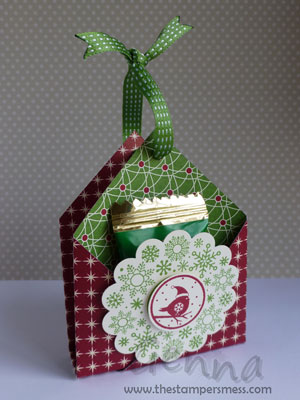 This cute double-sided treat holder is so easy – just four score lines and four stamped and punched images – and so versatile. You can tie the ribbon high to hang it up or lower down for a perfect place setting decoration. I’ve put a couple of chocolates in mine but you could also use any combination of coffee sachets, tea bags or other treats.