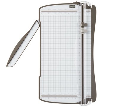 - Extra wide surface with 16cm grid so there’s no need to open the extension arm to cut either A4 or 12×12 cardstock in half.